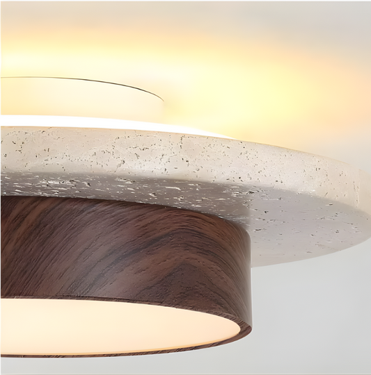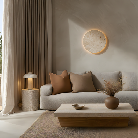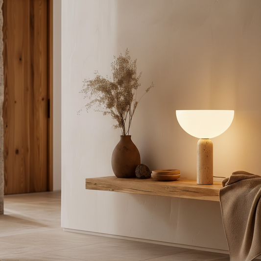 Travertin, metaal, keramiek en glas vormen samen een tijdloze compositie die rust zichtbaar maakt.